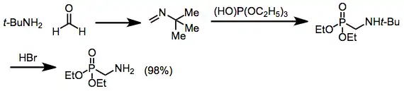Las iminas también pueden sufrir la reacción (reacción de Pudovik), produciendo fosfonatos de α-alquilamina.[13] Las aminas primarias se pueden producir solo después de la hidrólisis ácida de una terc-butilamina intermedia;[14] ya que el uso de iminas no sustituidas requiere condiciones muy duras y proporciona bajos rendimientos: