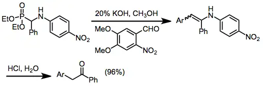 Cuando se emplean fosfonatos en presencia de cantidades catalíticas de base, pueden producirse óxidos de fosfina. Las sales de sodio de los ácidos fosfónicos históricamente han funcionado bien en este contexto, y se han utilizado bases como la amiduro de sodio.[8] Sin embargo, la inducción asimétrica y la adición directa selectiva (para compuestos de carbonilo conjugados) se pueden lograr en presencia de bases de aminas quirales:[9]