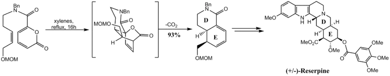 En su síntesis de reserpina en 1980,[78] Paul Wender y sus compañeros de trabajo utilizaron una reacción de Diels-Alder para establecer el marco de cis-decalina de los anillos D y E del producto natural. El Diels-Alder inicial entre el ácido 2-acetoxiacrílico y el 1,2-dihidropiridin-1-carboxilato que se muestra a continuación coloca al grupo carboxilo recién instalado en una posición para reorganizar exclusivamente los anillos fusionados en cis después de la conversión al isoquinuclideno que se muestra a continuación. La fusión cis permitió el establecimiento de la estereoquímica en C17 y C18: primero por escisión del grupo acetato en C18 para dar una cetona que pueda modular la estereoquímica del grupo metoxi C17, y luego por reducción de la cetona en C18 de Exo cara para lograr la estereoquímica del producto final.