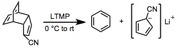 La mediación base puede usarse para inducir rDA en los casos en que los productos separados son menos básicos que el material de partida. Esta estrategia se ha utilizado, por ejemplo, para generar aniones ciclopentadienilo aromáticos a partir de aductos de ciclopentadieno.[59] Strategically placed electron-withdrawing groups in the starting material can render this process essentially irreversible.