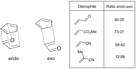 Las reacciones de Diels-Alder en las que se generan estereocentros adyacentes en los dos extremos de los enlaces simples recién formados implican dos posibles resultados estereoquímicos diferentes. Esta es una situación estereoselectiva basada en la orientación relativa de los dos componentes separados cuando reaccionan entre sí. En el contexto de la reacción de Diels-Alder, el estado de transición en el que el sustituyente más significativo (un grupo de extracción y / o conjugación de electrones) en el dienófilo se orienta hacia el sistema dieno π y se desliza debajo de él a medida que la reacción tiene lugar conocido como el estado de transición endo. En el estado de transición exo alternativo, está orientado lejos de él. (Hay un uso más general de los términos endo y exo en la nomenclatura estereoquímica).