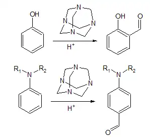 - La tetrametilenhexamina dona el carbono de un grupo formiliminio a un sustrato aromático por sustitución electrófila aromática, formando así la ciclohexanodienona como intermediario.