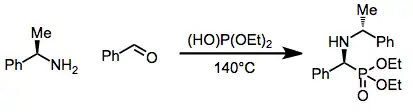 Se han desarrollado variantes enantioselectivas de la reacción Kabachnik-Fields, por ejemplo, el empleo de α-metilbencilamina proporciona un α-aminofosfonato quiral no racémico:[6]