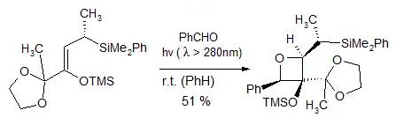 Se pueden obtener 3 - (sililoxi)oxetanos por irradiación de mezclas de aldehídos aromáticos y sililenoléteres en benceno como disolvente. Las reacciones se producen con alta diastereoselectividad simple y con altadiastereoselectividad facial cuando R1 es quiral. Bajo condiciones similares, pero con acetonitrilo en lugar de benceno como disolvente, la reacción Paternò-Büchi de N-acil enaminas (enamidas) produce la correspondiente protección de 3 aminooxetanos.[5]