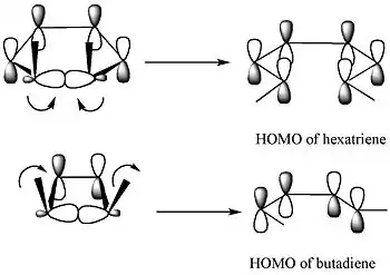 De acuerdo con la teoría de los orbitales moleculares frontera, el enlace sigma en el anillo se abrirá de tal forma que los orbitales p resultantes tengan la misma simetría que el HOMO del producto.[4]