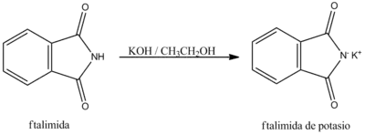 La ftalimida al reacionar con hidróxido de potasio con etanol (reactivo conocido como potasa alcohólica) produce la ftalimida de potasio mediante una reacción ácido-base.[1]