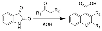 La reacción de N-acilisatinas en presencia de base da como productos ácidos 2-hidroxi-quinolina-4-carboxílicos.[6]
