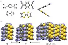 Las interacciones coulombianas se manifiestan en algunos sólidos moleculares. Un ejemplo bien estudiado es la sal iónica radical TTF-TCNQ con una conductividad de 5 x 102 Ω-1 cm-1,[5] mucho más cercana al cobre (ρ = 6 x 105 Ω-1 cm-1)[8] que muchos sólidos moleculares.[32][18][31] La interacción coulombiana en el TTF-TCNQ se debe a la gran carga negativa parcial (δ = -0,59) de la molécula ciano del TCNQ a temperatura ambiente.[5] Como referencia, una molécula completamente cargada δ = ±1.[5] Esta carga negativa parcial provoca una fuerte interacción con la molécula tiol del TTF. La fuerte interacción conduce a una alineación favorable de estos grupos funcionales adyacentes entre sí en estado sólido,[5][32] mientras que las interacciones π-π hacen que el TTF y el TCNQ se apilen en columnas separadas.[10][32]
