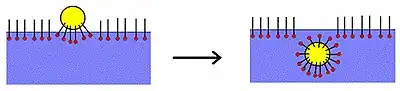 Al contacto con el agua las moléculas individuales se orientan de tal modo que la parte hidrofóbica sobresale del nivel del agua, encarándose al aire, mientras tanto la parte hidrofílica se queda sumergida. Otro fenómeno es que las moléculas anfifílicas se alinean de tal manera que las partes hidrofílicas quedan de un lado y las partes hidrófobicas del otro lado, por lo que empiezan a formar burbujas,las partes hidrófobas quedan en el centro, y los restos solubles en agua quedan entonces en la periferia disueltos en el agua. Estas estructuras se denominan micelas.