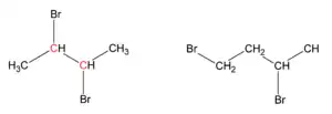 De igual manera, en un gem-dibromuro el prefijo gem, una abreviatura de geminal, señala que ambos átomos de bromo están enlazados al mismo átomo. Por ejemplo, el 1,1-dibromobutano es geminal.