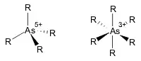 Los compuestos de arsénico se parecen, en algunos aspectos, a los del fósforo, que ocupa el mismo grupo (columna) de la tabla periódica. Los estados de oxidación más comunes del arsénico son: -3 en los arseniuros, que son compuestos intermetálicos similares a aleaciones, +3 en los arsenitos y +5 en los arsenatos y la mayoría de los compuestos organoarsénicos. El arsénico también se enlaza fácilmente consigo mismo, como se ve en los iones cuadrados As3−4 en el mineral escuterudita.[11] En el estado de oxidación +3, el arsénico es típicamente piramidal debido a la influencia del par solitario de electrones.[4]
