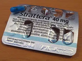 La atomoxetina es un inhibidor de la recaptación de noradrenalina, indicado exclusivamente para el tratamiento del TDAH. A pesar de que suele clasificarse como antidepresivo, no tiene efectos clínicos estudiados y probados para ese propósito. El principal criterio para incluirlo en esa clase farmacológica se basa en la ausencia de propiedades discriminativas de tipo estimulante psicomotor, las cuales son características de las medicaciones tradicionales para el TDAH. Sin embargo, de acuerdo con los criterios de la codificación ATC, la atomoxetina integra el grupo farmacológico de los estimulantes sustancia cuyo perfil es novedoso y difícil de categorizar, a la que se atribuyen propiedades activantes selectivas sobre las funciones ejecutivas y la cognición, y nootrópicos y, más específicamente, pertenece a la familia de las aminas simpaticomiméticas. No obstante, se trata de una molécula que ha demostrado potenciar los mecanismos inhibitorios implicados en el control de las conductas impulsivas.[1][2]
