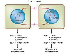 La diferenciación celular es el proceso por el que surgen distintos tipos de células funcionales en el desarrollo. Por ejemplo, las neuronas, las fibras musculares y los hepatocitos (células hepáticas) son tipos bien conocidos de células diferenciadas. Las células diferenciadas suelen producir grandes cantidades de unas pocas proteínas necesarias para su función específica, lo que les confiere el aspecto característico que permite reconocerlas al microscopio óptico. Los genes que codifican estas proteínas son muy activos. Normalmente su estructura cromatínica es muy abierta, lo que permite el acceso de las enzimas de transcripción, y factores de transcripción específicos se unen a secuencias reguladoras en el ADN para activar la expresión génica.[4][5] Por ejemplo, NeuroD es un factor de transcripción clave para la diferenciación neuronal, miogenina para la diferenciación muscular y HNF4 para la diferenciación de hepatocitos. La diferenciación celular suele ser la etapa final del desarrollo, precedida de varios estados de compromiso que no están visiblemente diferenciados. Un único tejido, formado a partir de un único tipo de célula progenitora o célula madre, suele estar compuesto por varios tipos celulares diferenciados. El control de su formación implica un proceso de inhibición lateral,[6] basado en las propiedades de la vía de señalización Notch.[7] Por ejemplo, en la placa neural del embrión este sistema opera para generar una población de células precursoras neuronales en las que NeuroD está altamente expresada.