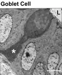 Caliciforme (asterisco) con granos de mucina en su mitad superior. Microscopio electrónico de transmisión.