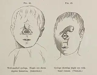 Los defectos de fusión durante la formación de los ojos varían desde parcial (sinoftalmia, dioftalmia) a completa (monoftalmia).[1]