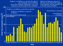 La contaminación marina se produce también a través de la atmósfera. El viento arrastra polvo y escombros, incluyendo bolsas de plástico, hacia el mar desde vertederos y otras zonas terrestres. Polvo proveniente del Sahara se traslada alrededor de la periferia sur de la cresta subtropical hacia el Caribe y Florida durante la temporada cálida cuando la cresta se fortalece, moviéndose hacia el norte a través del Atlántico subtropical. Otro movimiento global de polvo ocurre desde los desiertos Gobi y Taklamakan, por Corea, Japón y el norte del Pacífico a las Islas Hawaianas.[19] El aumento de los períodos de sequía en África a partir de la década de 1970, también ha empeorado el traslado de polvo. Aunque existe una gran variabilidad en el traslado anual de polvo hacia el Caribe,[20] el flujo suele ser mayor durante las fases positivas de la oscilación del Atlántico Norte.[21] El USGS vincula los episodios de descarga de polvo a una disminución en la salud de los arrecifes de coral en todo el Caribe y Florida, principalmente desde la década de 1970.[22]