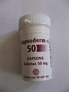 - ↑ Zhu, YI; Stiller, MJ (2001 Sep). «Dapsone and sulfones in dermatology: overview and update». J Am Acad Dermatol 45 (3): 420-34. PMID 11511841. doi:10.1067/mjd.2001.114733.