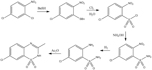 El diazóxido puede ser preparado desde el dicloronitrobenceno:[4]
