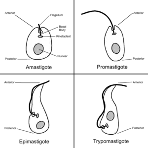 - Los parásitos liberados de la célula se convierten en promastigotos y tripomastigotos. Estos, que son liberados a la sangre circulante, son de un tamaño total que varía entre 15 y 20 µm tienen flagelo libre, un cinetoplasto voluminoso, terminal o subterminal que contiene el 30 % del ADN del parásito, y un núcleo oval. Estos tripomastigotes pueden infectar otras células, pero no son capaces de multiplicarse en la sangre, ya que la única forma replicativa en el vertebrado es la forma amastigote intracelular. Invaden otras células, para repetir el ciclo.[75]