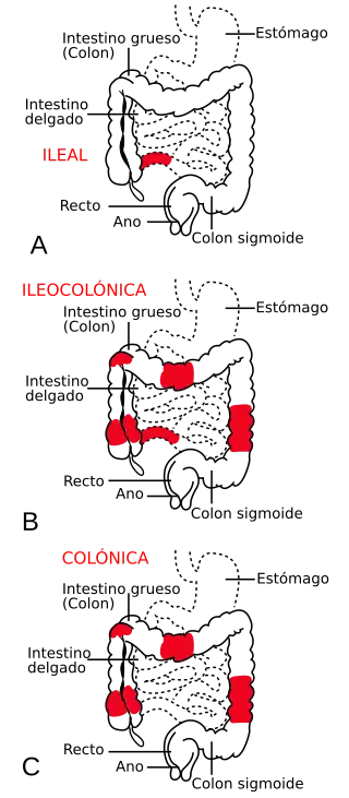 • Ileocolitis, es la forma más común, afecta la parte inferior del intestino delgado (íleon) y el intestino grueso (colon).
