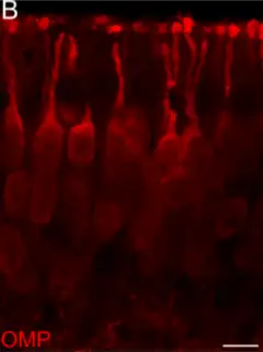 El olfato resulta del desarrollo y la interacción adecuados de los dos componentes de la vía olfatoria primaria: el epitelio olfativo y el bulbo olfatorio.[18] El epitelio olfativo contiene neuronas sensoriales olfativas, cuyos axones inervan el bulbo olfatorio. Para que las neuronas sensoriales olfativas funcionen correctamente, deben expresar los receptores de olor y las proteínas de transducción adecuadas en los cilios no móviles que se extienden desde la protuberancia dendrítica además de proyectar sus axones hacia el bulbo olfatorio.[19]