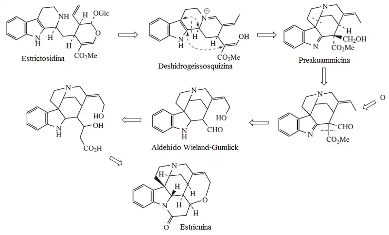 El iridoide secologanina se condensa con triptamina para dar estrictosidina. Ésta pierde la unidad de glucosa y posteriormente sufre una serie de transposiciones para dar el alcaloide deshidrogeisoesquizina. Este precursor por endociclización produce la preakuamicina, la cual se oxida, se descarboxila, y sufre una condensación aldólica con acetil coenzima A, para dar así la estricnina.[5]