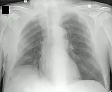 Neumonía apical derecha: en la FQ, la infección crónica da lugar a la destrucción del parénquima pulmonar, ocasionando por último la muerte por insuficiencia respiratoria. | ||