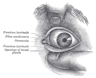 ![]() Frente del ojo izquierdo con los párpados separados para mostrar el canto medial. (La fisura palpebral, visible pero no rotulada, está ensanchada artificialmente). | ||
