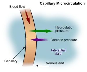 El plasma sanguíneo arterial, el líquido intersticial y la linfa interactúan a nivel de los capilares sanguíneos. Los capilares son permeables y el agua puede entrar y salir libremente. En el extremo arteriolar del capilar, la presión sanguínea es mayor que la presión hidrostática en los tejidos.[28][16] Por lo tanto, el agua se filtrará del capilar hacia el líquido intersticial. Los poros a través de los cuales se mueve esta agua son lo suficientemente grandes como para permitir que todas las moléculas más pequeñas (hasta el tamaño de proteínas pequeñas como la insulina) también se muevan libremente a través de la pared capilar. Esto significa que sus concentraciones a través de la pared capilar se igualan y, por lo tanto, no tienen efecto osmótico (debido a la presión osmótica causada por estas pequeñas moléculas e iones, llamada presión osmótica cristaloide para distinguirla del efecto osmótico de las moléculas más grandes que no pueden moverse la membrana capilar: es la misma en ambos lados de la pared capilar).