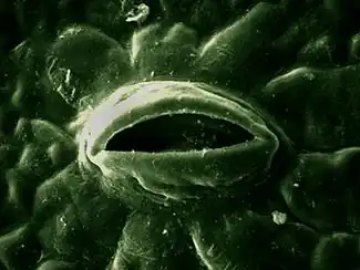 - La escasez de agua: ante la falta de agua en el terreno y de vapor de agua en el aire disminuye el rendimiento fotosintético. Esto se debe a que la planta reacciona, ante la escasez de agua, cerrando los estomas para evitar su desecación, dificultando de este modo la penetración de dióxido de carbono. Además, el incremento de la concentración de oxígeno interno desencadena la fotorrespiración. Este fenómeno explica que en condiciones de ausencia de agua, las plantas C4 sean más eficaces que las C3.[27][28]