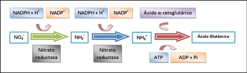 En un primer momento, los iones nitrato se reducen a iones nitrito por la enzima nitrato reductasa, requiriéndose el consumo de un NADPH. Más tarde, los nitritos se reducen a amoniaco gracias, nuevamente, a la enzima nitrato reductasa y volviéndose a gastar un NADPH. Finalmente, el amoniaco que se ha obtenido y que es nocivo para la planta, es captado con rapidez por el ácido α-cetoglutárico originándose el ácido glutámico (reacción catalizada por la enzima glutamato sintetasa), a partir del cual los átomos de nitrógeno pueden pasar en forma de grupo amino a otros cetoácidos y producir nuevos aminoácidos.
