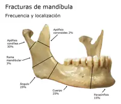 - Fracturas de las ramas mandibulares (ramus mandibulae): pueden afectar al ángulo mandibular (angulus mandibulae), a la apófisis coronoides mandibular (processus coronoideus mandibulae) o a las apófisis condíleas (o cóndilos) mandibulares (processus condylaris).[4]