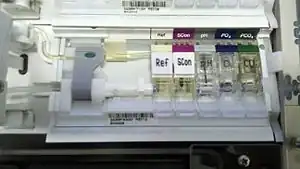 Detalle de la cámara de medición de gases, donde es posible apreciar los electrodos de medición: de izquierda a derecha el electrodo de referencia, y el electrodo de medición de continuidad de la muestra, electrodo de pH, electrodo de PO2, y el electrodo de PCO2 (Cobas b 221 Roche Diagnostics).