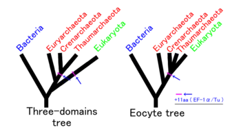 Una evidencia encontrada por un equipo japonés en 1989 encuentra relación entre eucariontes y arqueas en los factores de elongación EF-Tu y EF-G.[3] Luego se observa que esta relación es más cercana con Crenarchaeota, lo que da un gran respaldo a la hipótesis del eocito.[4]