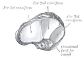El hueso navicular[1] es un hueso del pie, corto, par y asimétrico; tiene seis caras, anterior y posterior, externa e interna, superior e inferior ; dos bordes, superior e inferior, y dos extremos, externo e interno.