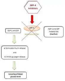 El efecto ventajoso de estos fármacos reside no en la propia inhibición de la DPP-4, sino en los efectos que de esta inhibición se derivan, como es la mayor semi-vida de eliminación (vida media) de las incretinas. Estas hormonas llamadas incretinas (Péptido similar al glucagón tipo 1 o (GLP-1: Glucagon-Like Peptide-1) y Glucose-dependent Insulinotropic Polypeptide realizan una serie de acciones ventajosas para el tratamiento de la Diabetes Mellitus Tipo 2, como son el estímulo de la secreción de insulina por las células beta del páncreas a la vez que tienen un efecto trófico positivo sobre estas células, retrasando la aparición de apoptosis e inhiben la liberación de glucagón por las células alfa.
