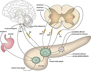 Los nervios extrapancreáticos se proyectan directamente a los islotes pancreáticos o bien convergen en los ganglios intrapancreáticos.[22]