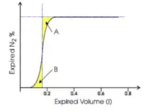 Para el cálculo del espacio muerto anatómico, se emplea una nueva gráfica donde se sustituye, en el eje de abscisas, el tiempo por el volumen total espirado, manteniéndose en ordenadas el valor de % de nitrógeno espirado. En el eje de abscisas habrá un punto desde el que trazando una vertical que corte la nueva curva sigmoidea, permita establecer dos áreas A y B de idéntica superficie delimitadas por la curva, la vertical y los límites superior e inferior de la gráfica. Dicho punto, referido al volumen espirado, será el espacio muerto anatómico.[2]