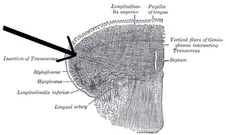 ![]() Plano frontal de la lengua. Músculo transverso señalado con una flecha. | ||