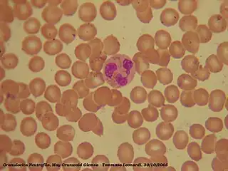 Los neutrófilos son leucocitos de tipo granulocito también denominados polimorfonucleares (PMN). Miden de 9 a 12 μm y es el tipo de leucocito más abundante de la sangre en el ser humano, representando en torno al 50-60 % de los mismos. Su periodo de vida media es corto, durando horas o algunos días. Su función principal es la fagocitosis de bacterias y hongos.[1]