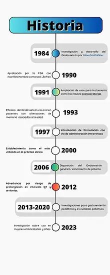 En 1991 se sustentó su eficacia para la prevención de las náuseas postoperatorias.[4][5] En 1997 se aprobó la formulación con vía de administración intravenosa favoreciendo el tratamiento intrahospitalario de pacientes con problemas de tolerancia a la vía oral.[6]