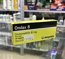 El Ondansetrón (DCI), es un fármaco desarrollado y comercializado por primera vez por GlaxoSmithKline como Zofran®) es un antagonista del receptor de serotonina 5-HT3, que se prescribe como profilaxis de náuseas y vómitos, en pacientes que requiere quimioterapia y radioterapia. También es eficaz para parar los vómitos y las náuseas provocadas por la gastroenteritis.[1]Actúa tanto en el sistema nervioso periférico como central.[2] El ondansetrón reduce la actividad del nervio vago, que desactiva el centro del vómito en el bulbo raquídeo, y también bloquea los receptores de serotonina en la zona gatillo quimiorreceptora.