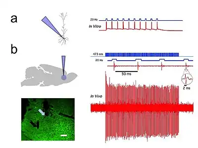 - ↑ Zemelman, B. V.; Lee, G. A.; Ng, M.; Miesenböck, G. (2002). "Selective photostimulation of genetically chARGed neurons". Neuron 33 (1): 15–22. doi:10.1016/S0896-6273(01)00574-8. PMID 11779476