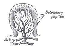![]() Vista semidiagramática de una porción de la mucosa de la lengua. Se observan dos papilas fungiformes. En algunas de las papilas filiformes las prolongaciones epiteliales se encuentran erectas, en una están extendidas y en tres están plegadas. | ||