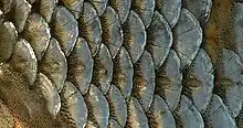 La epidermis es muy sencilla, con una capa superficial de queratina.[11] La epidermis de los peces dispone de glándulas que secretan una sustancia llamada mucus que le proporciona protección, lubrica la superficie y disminuye la resistencia al roce con el agua.[12] La dermis es más compleja y está dividida en los dos estratos de tejido conjuntivo fibroso y laxo. En la dermis se originan las escamas y se encuentran los cromatóforos, por ejemplo con melanina, que dan el color a la piel.[4][11]