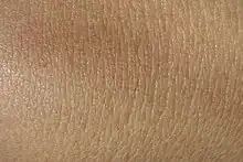 La piel humana es la cubierta exterior del cuerpo y forma parte del sistema tegumentario. La piel humana es el órgano más grande, extenso y pesado del cuerpo (alrededor de 10 % de la masa corporal total de un adulto medio).[1] En adultos, su superficie es de aproximadamente 1,8 m2,[2][3] su grosor varía de 0,5 mm (en los párpados) a 4-5 mm (parte superior de la espalda en particular).[4] Sin embargo, su superficie de intercambio es mucho más pequeña que la del pulmón (140 m2) o la del intestino (300 m2) y es mucho menos permeable.[5] La especialidad de la medicina que se ocupa de la piel y sus afecciones es la dermatología.