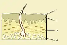 La epidermis se divide para su estudio, en varios estratos o capas. Las células que se forman mediante mitosis en las capas más internas, son empujadas a través de los estratos cambiando de forma y composición a medida que se diferencian y se llenan de queratina. Después de alcanzar la capa externa del estrato córneo, finalmente se "desprenden" (descamación). Este proceso de queratinización tiene lugar en cuestión de semanas. Antes se creía que el estrato córneo era "una capa epidérmica externa simple, biológicamente inactiva, que comprende una red fibrilar de queratina muerta".[16] Ahora se conoce que esto no es cierto y que el estrato córneo debe considerarse como un tejido vivo. Si bien es cierto que el estrato córneo está compuesto principalmente por queratinocitos diferenciados terminalmente llamados corneocitos anucleados, estas células permanecen vivas y metabólicamente funcionales hasta que se descaman.[17]
