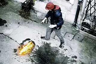 ![]() Un adolescente haciendo un pequeño incendio. | ||