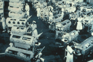 Las salas de los hospitales se llenaron de pulmones de acero Emerson durante el brote de poliomielitis de los años 1940 y 1950.[8][9] Con el éxito mundial de los programas de vacuna contra la poliomielitis que erradicaron prácticamente la enfermedad, y la llegada de ventiladores modernos que controlaron la respiración a través de la intubación de la vía respiratoria, el uso del pulmón de acero declinó bruscamente.