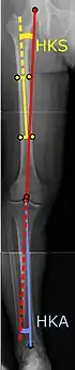 - ↑ Sheehy L, Felson D, Zhang Y, Niu J, Lam YM, Segal N, Lynch J, Cooke TD (Enero de 2011). «Does measurement of the anatomic axis consistently predict hip-knee-ankle angle (HKA) for knee alignment studies in osteoarthritis? Analysis of long limb radiographs from the multicenter osteoarthritis (MOST) study». Osteoarthritis and Cartilage 19 (1): 58-64. PMC 3038654. PMID 20950695. doi:10.1016/j.joca.2010.09.011.